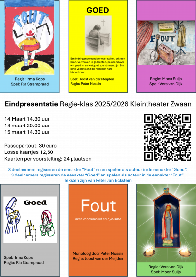 Vanuit Kleintheater Zwaan is dit jaar gestart met de informele 'Regieopleiding. Zes 'studenten' hebben zich aangemeld en zijn samen dit avontuur aangegaan.De studenten kregen twee bestaande eenakters: korte en krachtige toneelstukken, die elk ongeveer 10 tot 15 minuten duren: getiteld respectievelijk "Goed" en "Fout". Drie leerlingen zijn ieder voor zich aan de slag gegaan met de ene eenakter en de andere drie met de andere eenakter. Ze hebben allemaal hun eigen regieplan gemaakt. Alle regisseurs in spé zijn tevens ook acteur. Wie de ene eenakter regisseert, is acteur in de andere eenakter. Zo zijn er drie koppels gemaakt: de ene acteert "Goed" en regisseert "Fout" en andersom. Zo leren ze het regisseren en hoe het is om geregisseerd te worden.